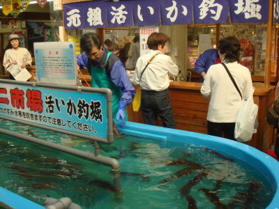 昔は、リヤカーを引いて「イガーイガー」というイカ売りが。冷蔵庫の余り普及していない当時としては、ありがたい出張販売だった。今は自動車による販売となり、生活の風情が消え失せた。久しぶりで函館朝市に行った。砕いた氷の上のイカは茶色に輝き、活きのいいのがひと目でわかる。驚いたのは、イカの釣堀。その場でイカソーメンにしてくれるんです。値段は1匹1,500円。イカ虫は、転げまわる腹痛を起こすことも忘れないでね。若い人はイカのさばきかたをおとしよりから教わりましょう。